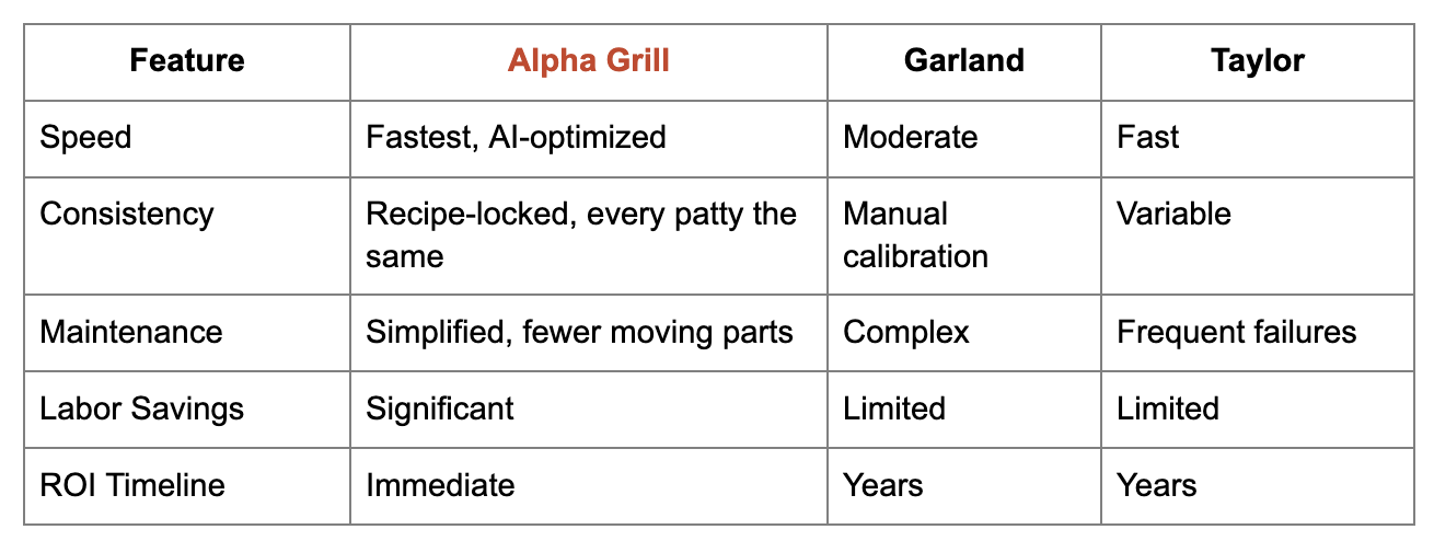 Alpha Grill wins on the metrics operators actually feel every shift throughput, consistency, labor, and total cost of ownership.